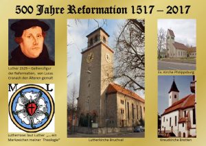 Die abgebildeten Kirchen stammen aus Bruchsal, Bretten und Philippsburg. Links die Abbildung von Martin Luther – gemalt von Lucas Cranach den Älteren. Darunter die „Luther-Rose“ – Luthers Siegel ab 1530 auf seinen Briefen.